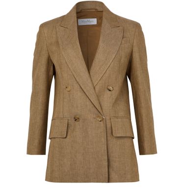 Max Mara's Gerla double-breasted linen blazer offers a timeless silhouette with its tailored collar and long sleeves. This elegant piece features a two-button closure, an appliquéd logo, and two flap pockets for practicality. Lined for comfort, it perfectly balances sophistication and ease, making it an essential addition to any wardrobe.
