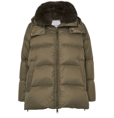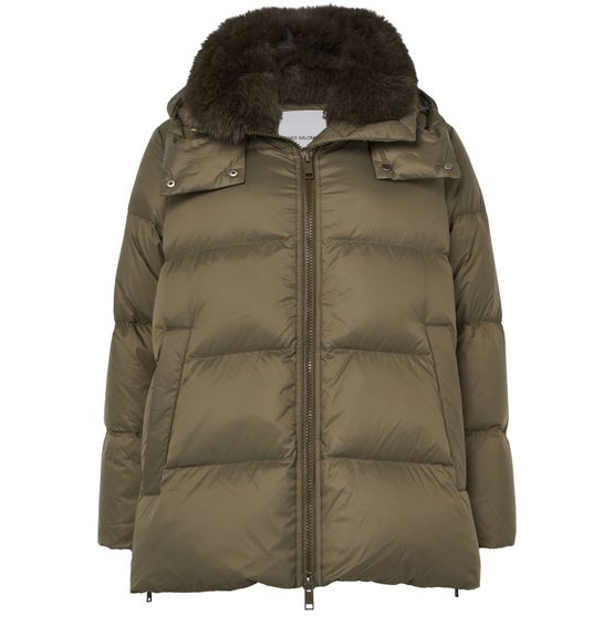 Unveil Yves Salomon's hooded puffer jacket with a fox fur collar, showcasing an oversized fit and short length for modern appeal. A padded texture and long sleeves add warmth, while side pockets and a zipper closure ensure practicality. This versatile piece transitions effortlessly from casual outings to formal settings.