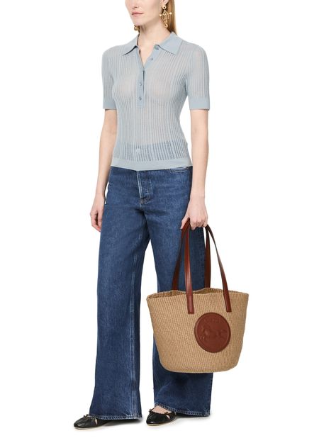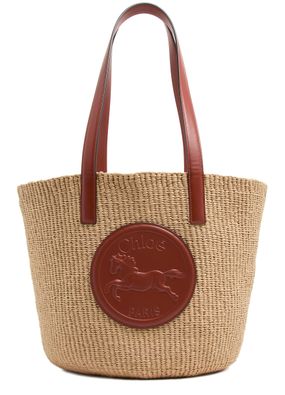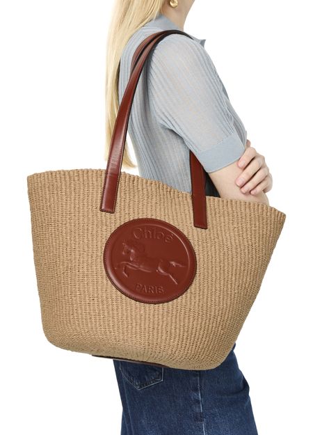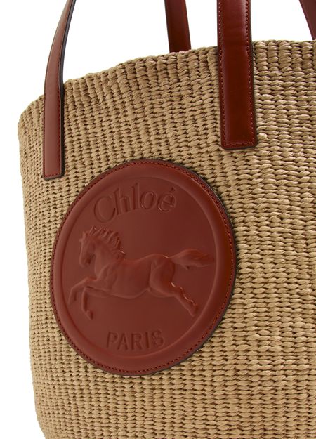 Chloé's Horse Medal basket is a chic shopper tote bag with a single compartment, perfect for everyday essentials. Its double handles allow for versatile styling, whether hand carried or worn on the shoulder. The front logo and appliquéd design, along with visible topstitching, add a touch of elegance to your look.