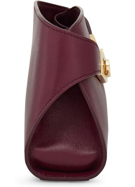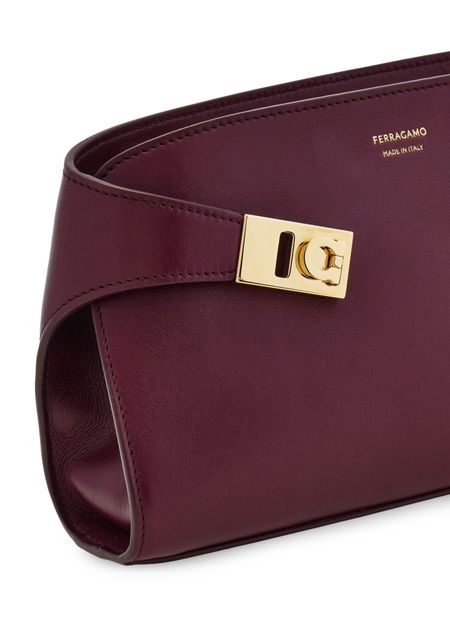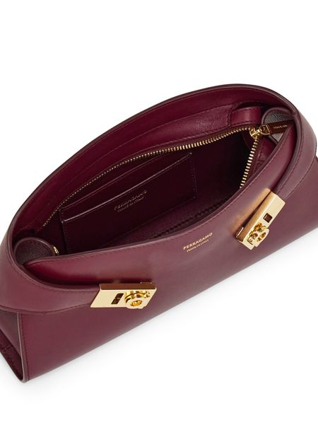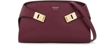 Reveal Salvatore Ferragamo's Hug crossbody bag, crafted from smooth leather with a refined gold finish. The visible topstitching and front logo in gold letters highlight its signature style, while the single handle and interior patch pockets offer both elegance and practicality for modern essentials.