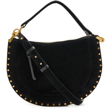 Unveil Isabel Marant's Oskan soft zipped bag, a masterpiece of suede craftsmanship. This hobo bag features a single handle and a thin, adjustable, detachable strap for versatile wear. Adorned with studded details and a zipper closure, it offers a single compartment with an interior pocket, all finished with gold-tone metallic details.