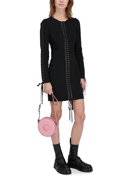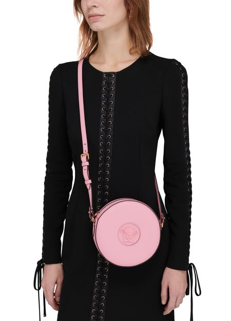 Description : Grained leather bag, thin adjustable strap, front logo, gold metal finishes, cotton lining, logo in gold letters, circular zipper closure, worn on the shoulder or crossbody.