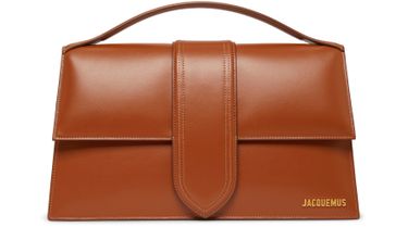 The Jacquemus Le Bambinou bag is crafted from smooth leather and features a handle and wide shoulder strap for versatile carrying options. The flap closure is adorned with the brand's logo in gold letters, while visible stitching adds a touch of detail. This bag can be hand carried, worn on the shoulder, or crossbody for effortless style.