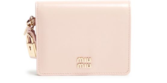 Reveal Miu Miu's leather coin purse with padlock details, crafted from smooth leather and adorned with metallic Miu Miu lettering. The gold finish, visible topstitching, and detachable keyring combine refined style with practical elegance for a modern accessory statement.