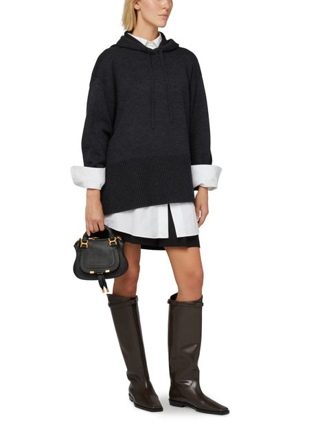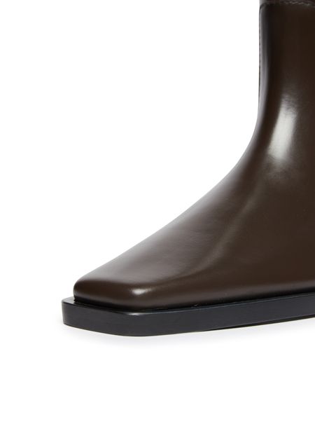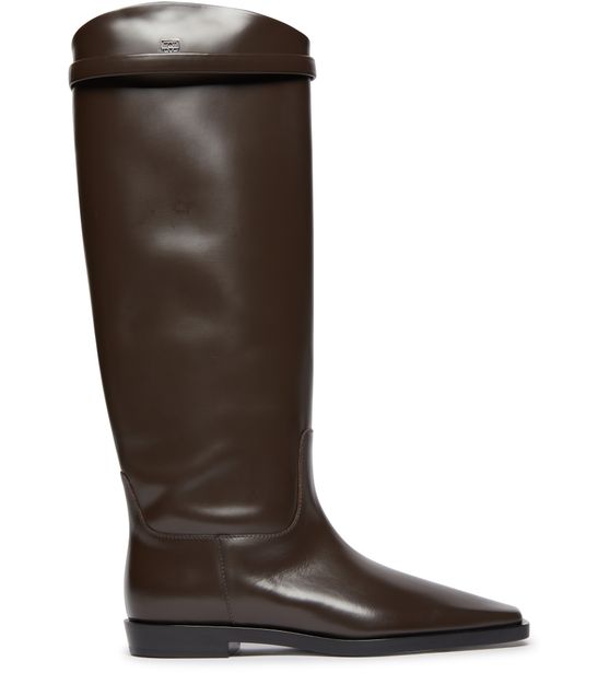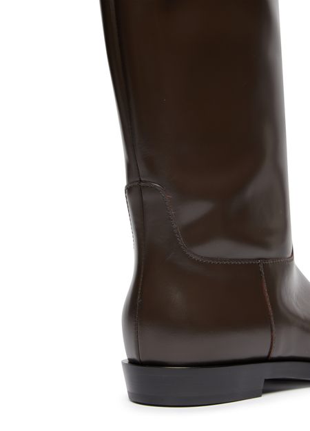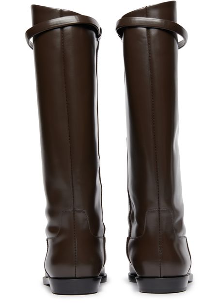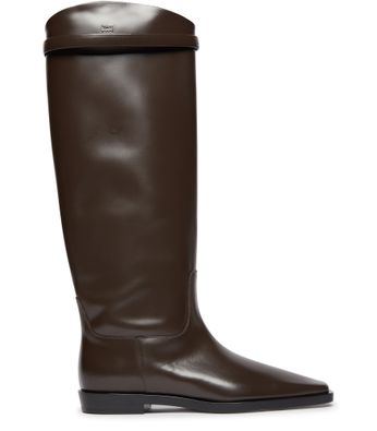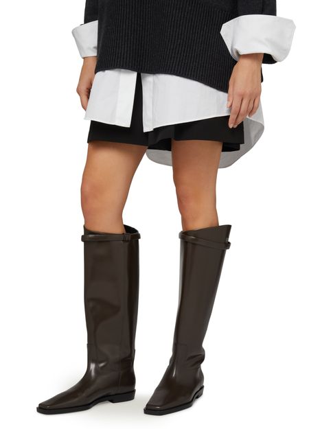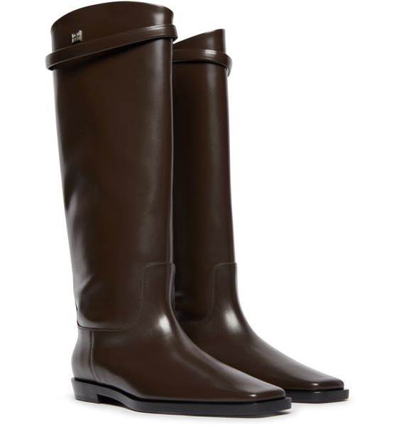These Toteme Riding boots feature a low heel and a square toe design. With a closed style and a pull-on design, they have a high-top upper that adds a touch of sophistication to your outfit. The metallic logo on the side adds a subtle branding detail.