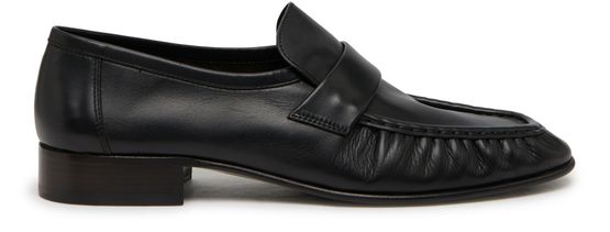 The Row Loafers are a sleek and sophisticated addition to any wardrobe. Made from smooth leather, these loafers feature a round toe and visible stitching for a classic look. The very thin sole and heel cushion provide comfort without sacrificing style. Perfect for dressing up or down.