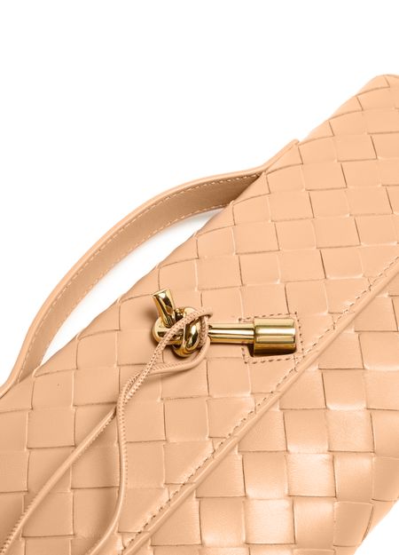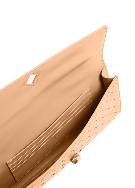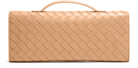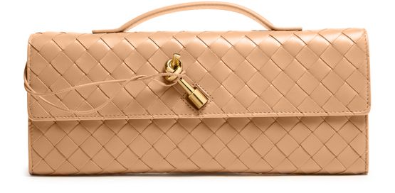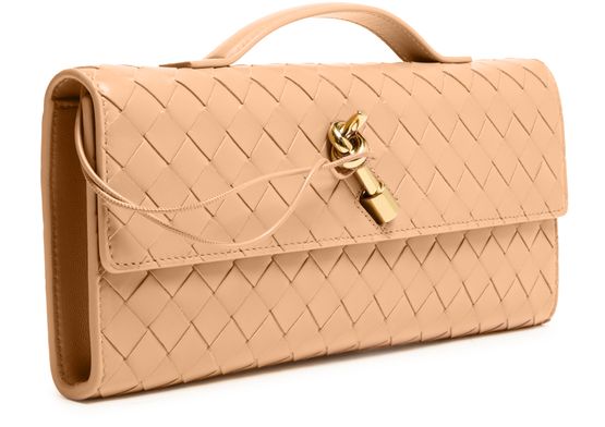 Bottega Veneta's Long Andiamo clutch with handle boasts a sleek design, perfect for hand carrying. Its flap closure secures your essentials, while the interior slots for cards keep you organized. The luxurious gold finish adds a touch of elegance, making it an ideal companion for any sophisticated outing.