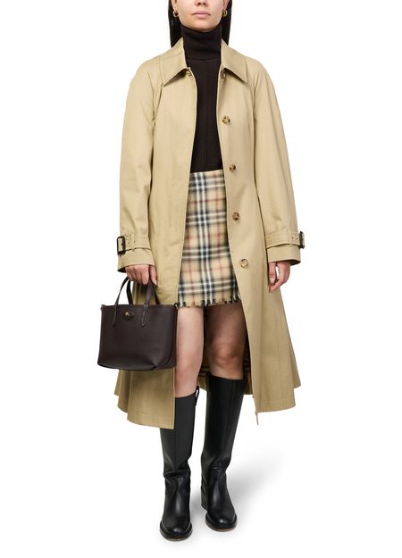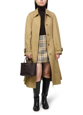 Reveal Burberry's long gabardine ellingham fit-and-flare car coat, a refined silhouette with a tailored fit and elegant collar. Button fastening and flap side pockets add functional sophistication, while the smooth gabardine fabric ensures versatility for both city strolls and formal occasions.