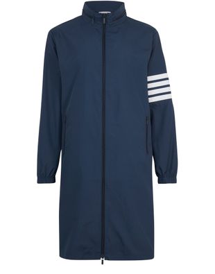 This longline parka, designed by Thom Browne, features a zippered opening the length of the piece, on the front as well as the back. It features the fashion house's 4 horizontal bands.