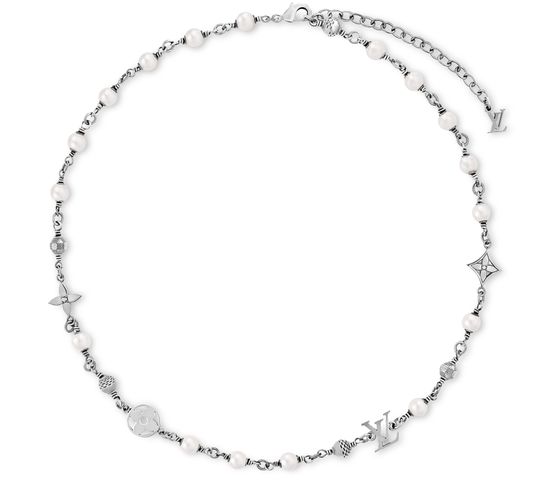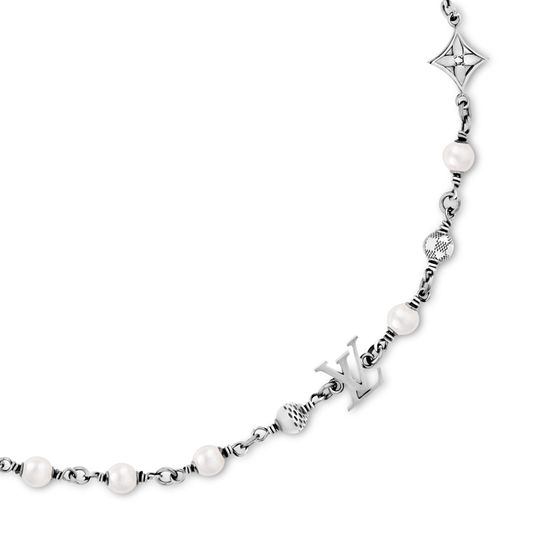 The LV Pearls necklace is a moody piece of jewelry that captures attention with its rich materials. Featuring a chain of pearls and House signature charms, the individual pieces are engraved with the Damier pattern. This is a style for the true Louis Vuitton lover, who appreciates the unexpected details.