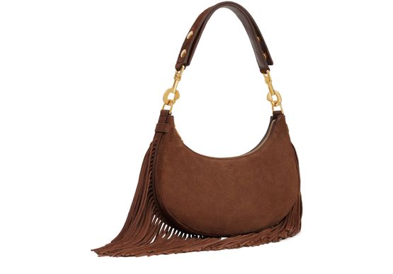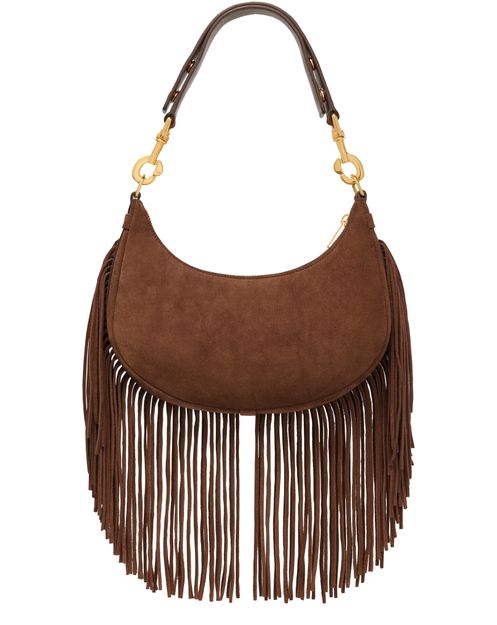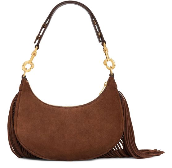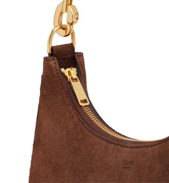 Celine's Medium Ava strap bag captivates with its sumptuous suede calfskin and playful fringes. Designed for versatility, it effortlessly transitions from shoulder to hand carry. With a secure zipped closure and spacious interior, it combines elegance and practicality, making it an essential companion for the modern, stylish individual.