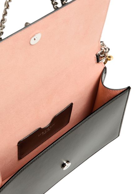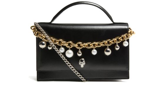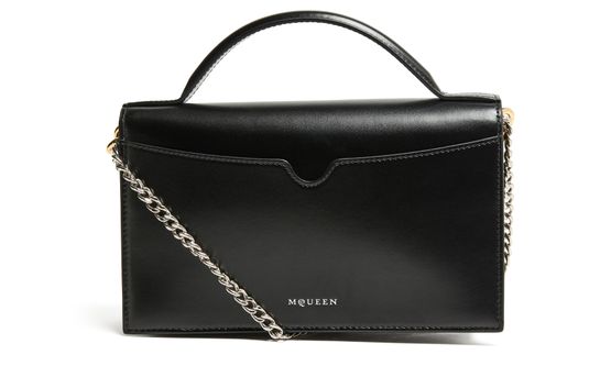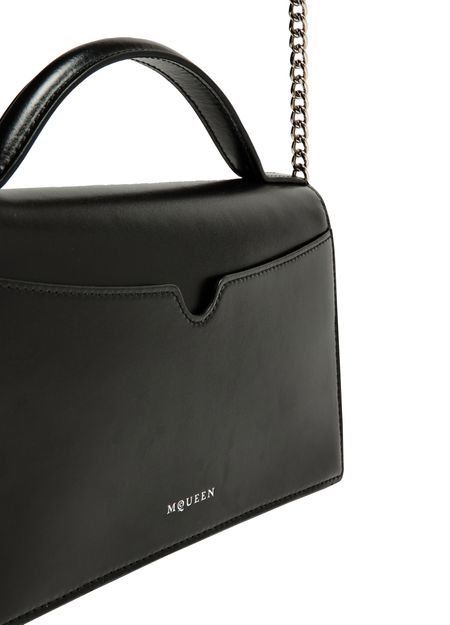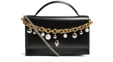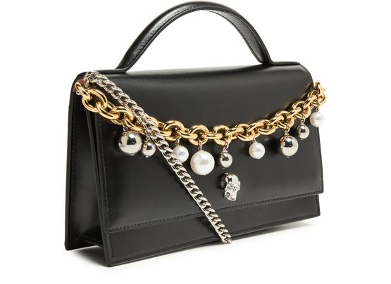 Reveal Alexander McQueen's Medium Skull handbag, crafted from smooth leather with a single handle and a decorative chain strap. The snap-button fastening, interior pocket, and gold finish highlight its refined design, while visible stitching and a front logo add signature flair to this modern accessory.