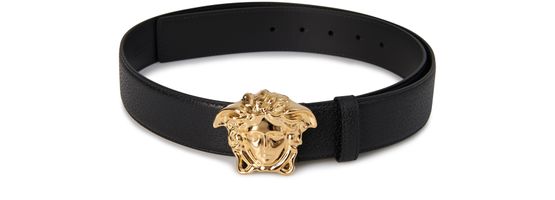 The golden face of Medusa, the iconic symbol of Versace, forms the buckle of this belt. It is made from black grained leather in Italy.