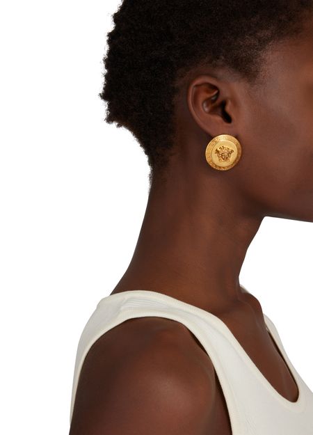 These golden metal earrings are designed by Versace. These rounded studs represent Medusa and are encircled by the iconic Greek Key motif.