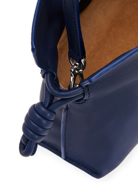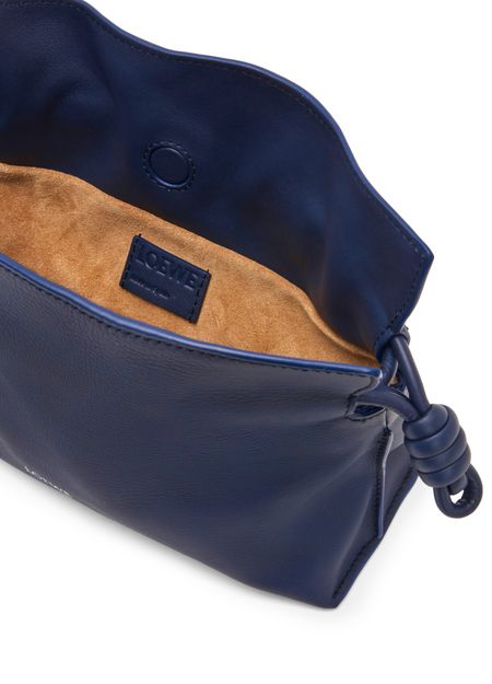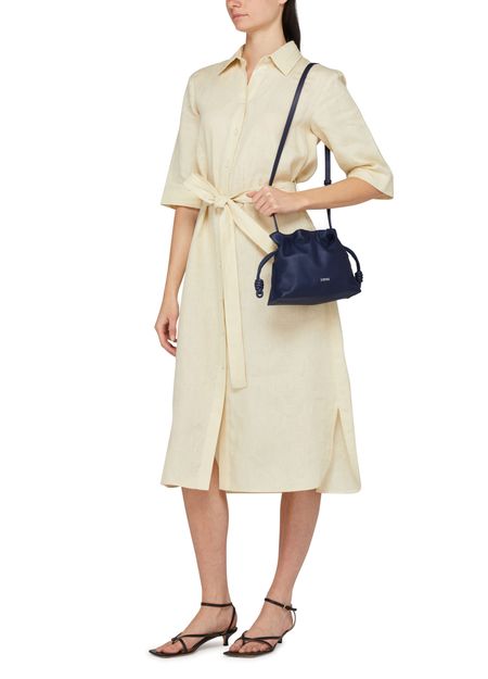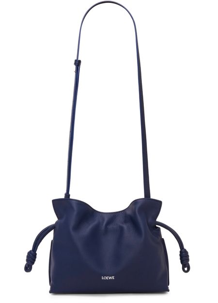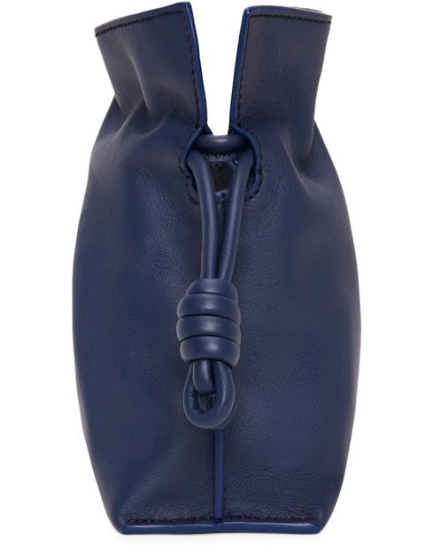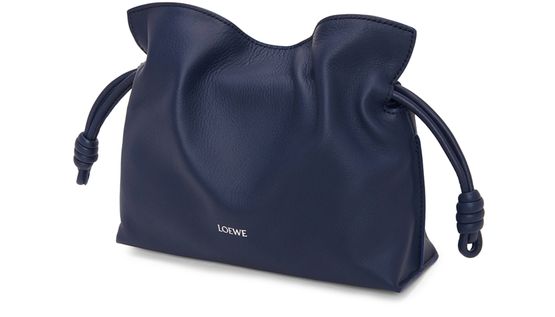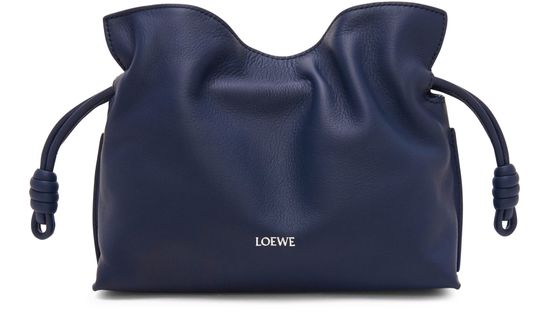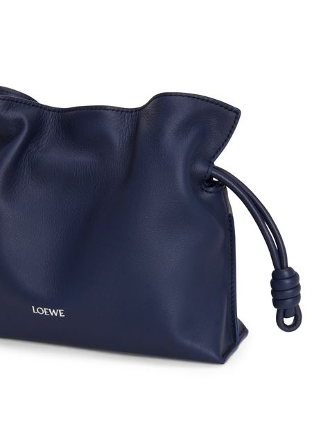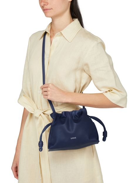 Loewe's Mini Flamenco clutch features a front logo in silver letters and a drawstring closure. It can be hand carried with its thin strap or worn on the shoulder or crossbody with the detachable strap. This versatile bag is perfect for adding a touch of elegance to any outfit.