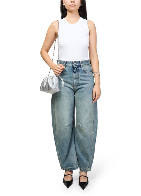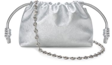 Reveal Loewe's mini flamenco purse in moiré print calfskin, a statement piece with a striking printed finish and refined silver accents. The chain strap and drawstring closure blend modern flair with practical elegance, making this shoulder bag a sophisticated choice for any occasion.