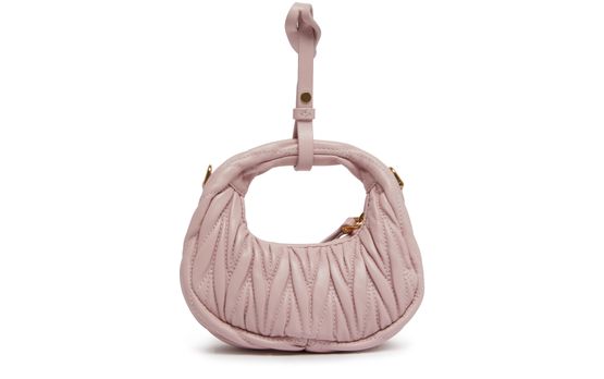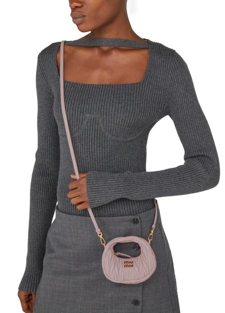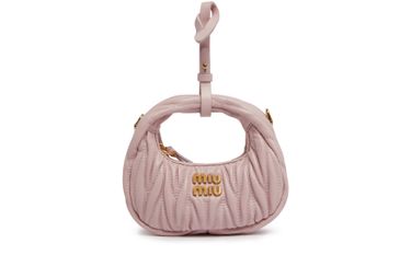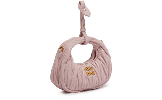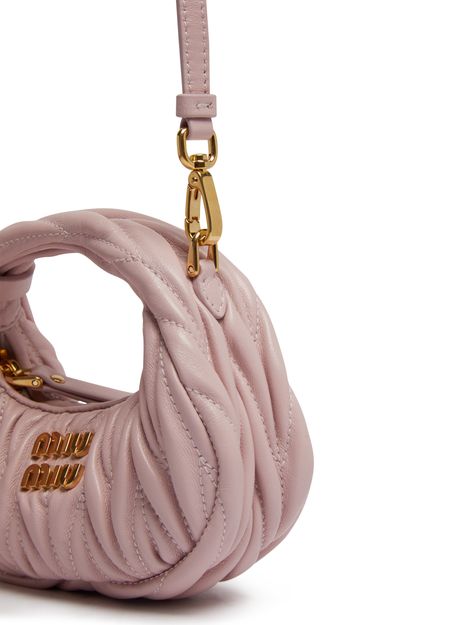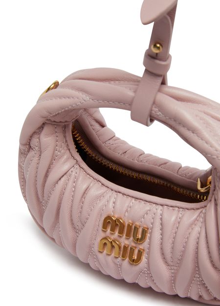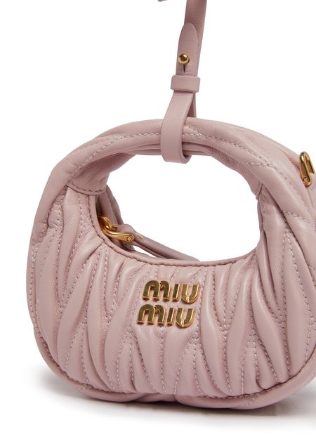 Miu Miu's Wander micro quilted nappa leather hobo bag showcases a slender adjustable and detachable shoulder strap, offering versatility for any occasion. A stylish handle adds to its charm, while the secure zipper closure keeps your essentials safe. The logo in gold letters elegantly accentuates this timeless accessory.