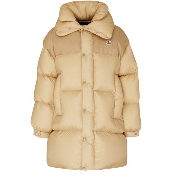 • Description : concealed zipper and snap fastening, chest logo, appliquéd logo, knee length, side welt pockets, long-sleeved, collar, puffer.