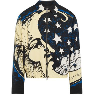 Amiri's Moonscape blouson is crafted with warm fabric, featuring a classic collar and zipper closure for a stylish touch. The buttoned cuffs add a touch of sophistication to the design, while the logo on the back and star motif give it a unique and edgy look.