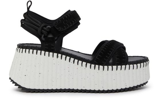 Introducing the Nama sandals from Chloé. These stylish sandals feature an open round toe, medium heel, and platform for added height and comfort. The leather loop at the back allows for easy slipping on and off, making them perfect for everyday wear. Elevate your summer wardrobe with these chic and versatile sandals.