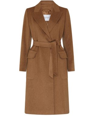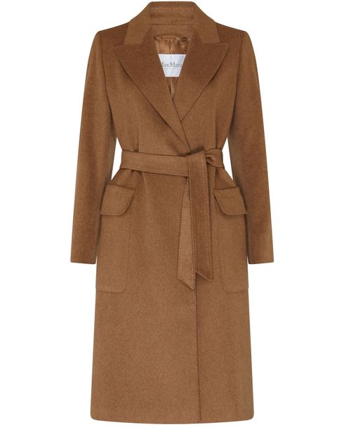 Max Mara's Nyssa belted coat elegantly wraps around the figure, showcasing a notched collar and a chic knee-length silhouette. With long sleeves and two flap pockets, it combines style and functionality. The appliquéd logo at the back adds a subtle touch of luxury, making it a must-have trench coat.