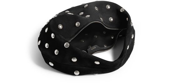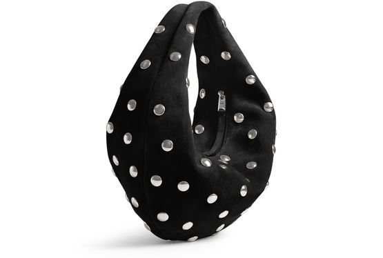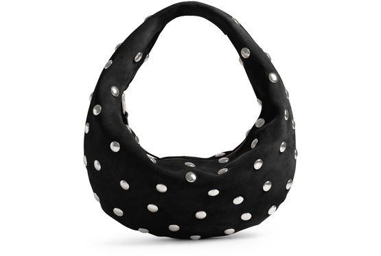Reveal Khaite's studded hobo bag, a statement piece defined by its single handle and silver finish. The zippered closure and interior pocket offer both security and organization, while the sleek silhouette and refined detailing make it a standout for modern wardrobes.