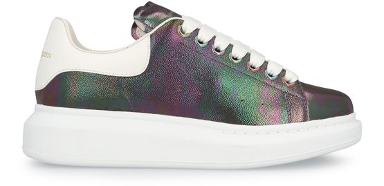 Alexander McQueen discreetly signs these oversized sneakers on the back of the foot. These sneakers have a pearly effect and are characterized by their large contrasting sole.