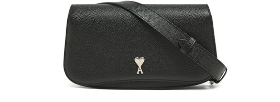 Ami's Paris crossbody bag showcases a sleek design with a flap closure and a single compartment for essentials. Its gold finish and metallic logo on the front add a touch of elegance. Featuring visible topstitching, an adjustable strap, and a thin strap, it can be worn on the hips or waist as a chic belt bag.