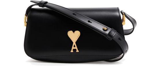 Ami's Paris shoulder bag is a chic mini bag that captivates with its magnetic flap closure and sleek silhouette. Featuring a gold finish and a metallic logo on the front, it boasts visible topstitching and a single handle. The adjustable thin strap allows for comfortable crossbody wear, making it a stylish companion.