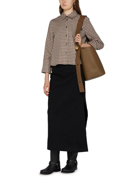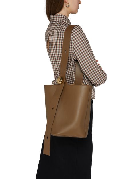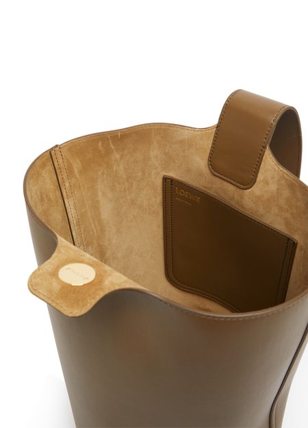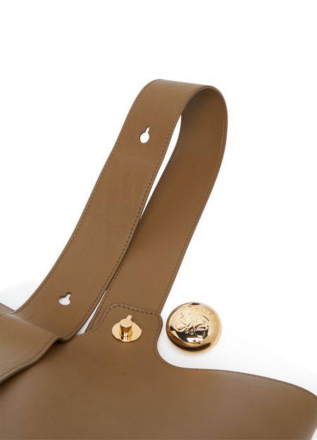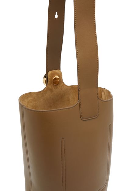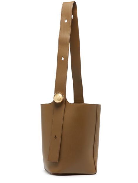 Loewe's Pebble bucket bag is a versatile accessory with a single compartment, logo on the side, and engraved logo. It has a gold finish and features a wide strap, single handle, and adjustable strap for hand carried convenience.
