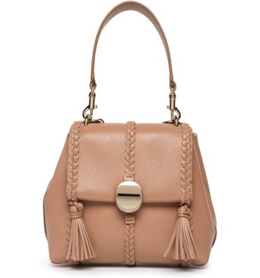 Chloe's Penelope small soft shoulder bag is crafted from grained leather, featuring a detachable handle and strap for versatile styling options. It has a flap closure with a logo clasp and fringe details for a bohemian touch. The logo in gold letters adds a subtle branded finish. It can be hand-carried, worn on the shoulder, or crossbody.