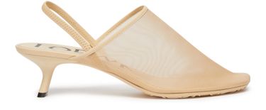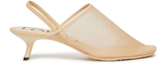 Loewe's Petal mesh sling-back mule 45 is a closed round toe pump with a medium stiletto heel. It features visible stitching, a rear strap, and a logo-printed insole for added style.