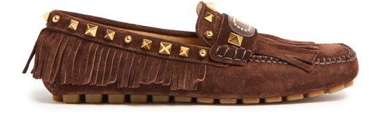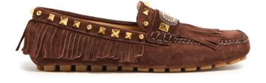 Valentino's Plaster Caster loafers showcase exquisite craftsmanship with visible stitching and studded details. The round toe design offers a classic silhouette, while fringe details add a touch of flair. A logo in gold letters graces the front, complemented by a logo-printed insole and a sleek gold finish, perfect for any occasion.