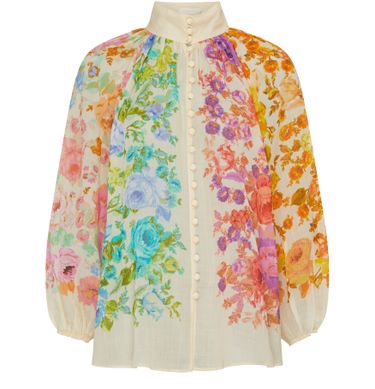 Zimmermann's Raie Blouse features a front buttoned closure and long-sleeved, high-neck design with raglan sleeves. The button fastening is covered in the same fabric as the multicolor, all-over floral print. The blouse also includes a logo at the back label for a touch of branding.