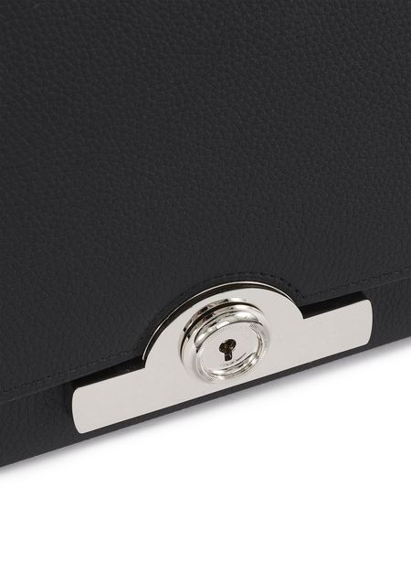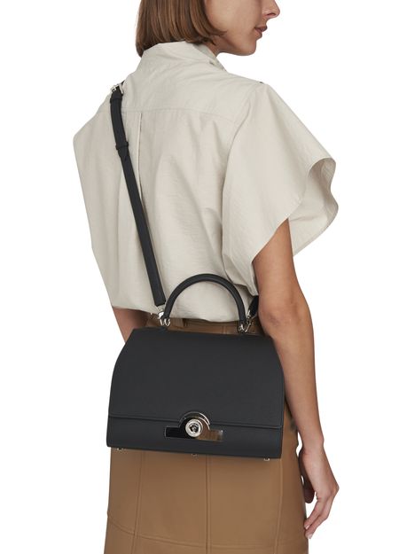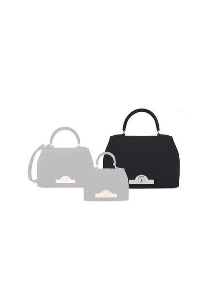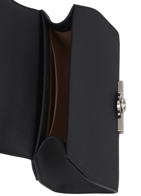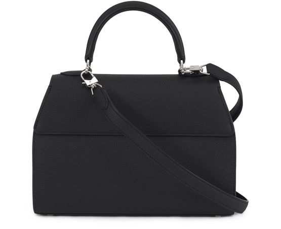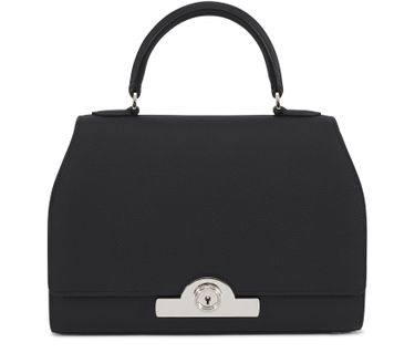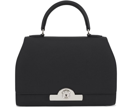 • Description : Leather handle, flap closure, engraved metallic logo clasp, metal with a silver finish.