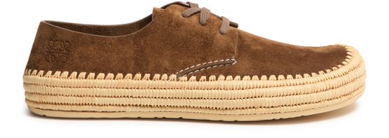 Unveil Loewe's Rio lace up espadrilles in suede and raffia, where classic design meets modern elegance. These espadrilles feature a round toe and flat heel, offering comfort with every step. The laces and strap closure ensure a secure fit, while the embroidered logo and visible stitching add a touch of refinement.