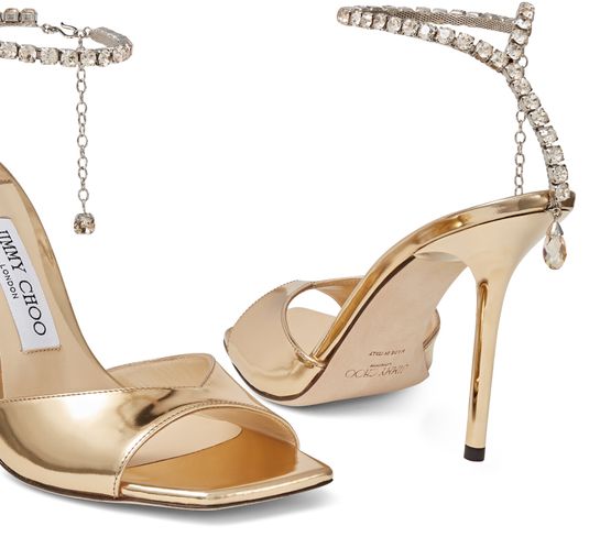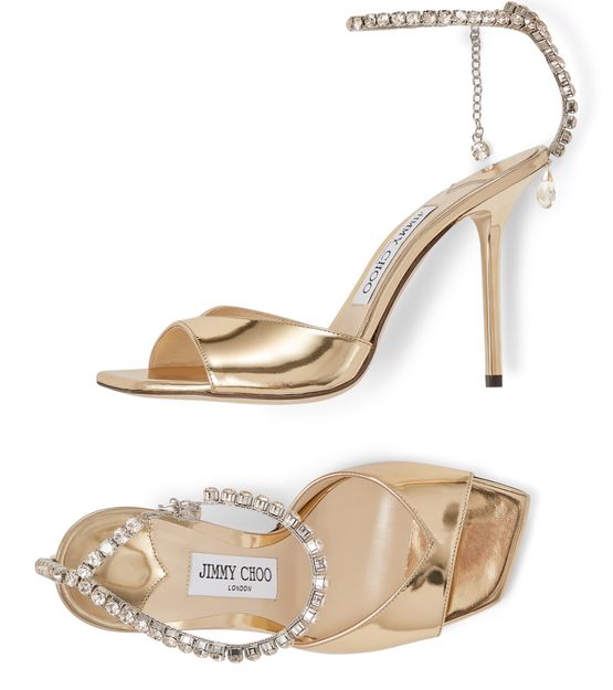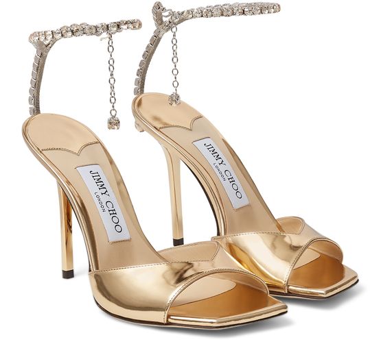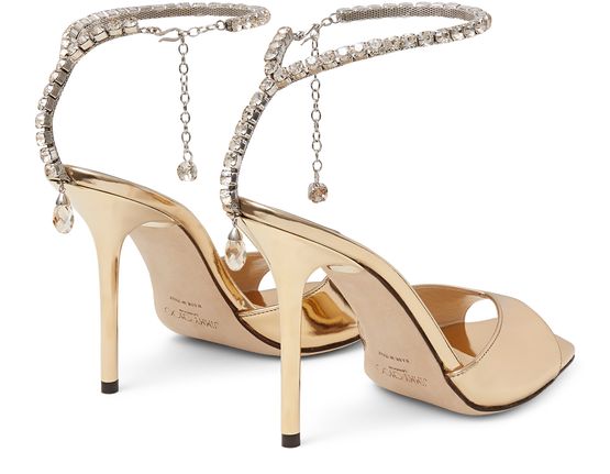 Jimmy Choo's Saeda 100 sandals are crafted from metallic leather, featuring an open square toe and a stiletto heel for a striking silhouette. The very thin sole provides elegance and sophistication, while the crystal-embellished strap adds a touch of glamour. Contrast details complete this chic and modern design.