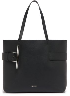 McQueen's T-Bar Sling tote bag showcases a single compartment for effortless organization. With double handles and a thin strap, it can be worn on the shoulder for versatility. The front logo in silver letters and striking visible topstitching add a touch of elegance, while the silver finish enhances its modern appeal.