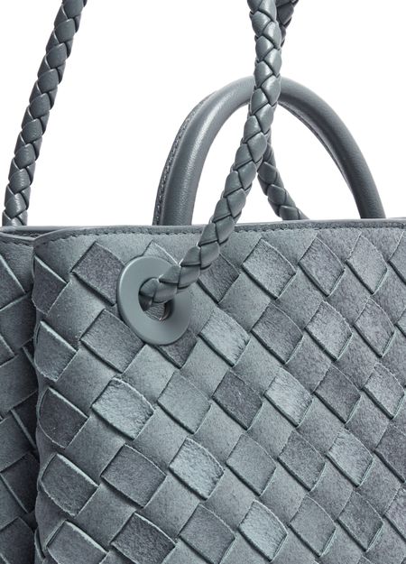 • Description : Shoulder bag, intrecciato weaving technique, single handle, leather handle, carry handle, suede, zipper closure, zippered interior pocket, leather, gold finish.