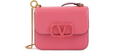 The sophisticated details on this bag affirm the iconic style of Valentino Garavani. The small Vsling bag has a flap with a fastener that has the brand's logo embossed on it. A functional piece that has a leather strap and gold tone chain so it can be worn over the shoulder, cross body or carried in the hand. It will complement a short dress or...