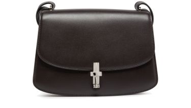 The Row Sofia 8.75 shoulder bag features a thin strap for wearing on the shoulder or crossbody. It also includes a single handle and flap closure with a silver finish. The adjustable strap and interior patch pockets offer versatility and functionality. The metallic logo on the front and printed logo add a touch of elegance.