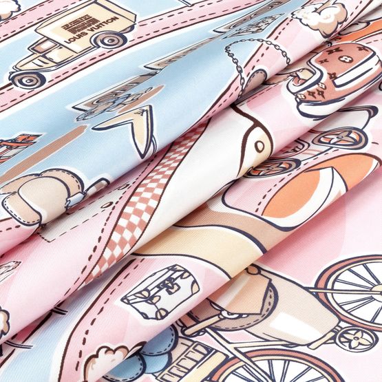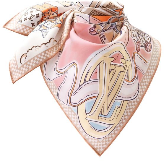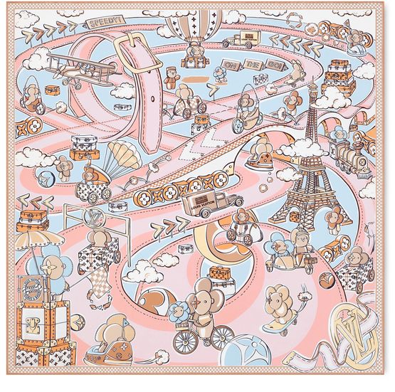 The Speedy Vivienne 90 square showcases the House’s loveable mascot in a fantastic new adventure, speeding by the Eiffel Tower on a racetrack lined with Louis Vuitton icons. Printed on sumptuous silk, Vivienne appears riding on every kind of vehicle, from a bicycle to a balloon. This fun, colorful accessory is a must-have for Vivienne fans.