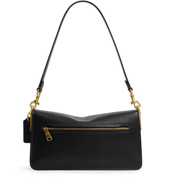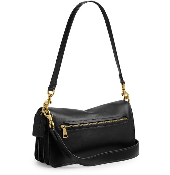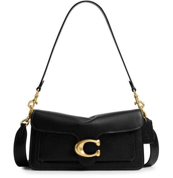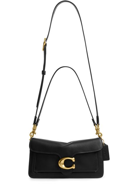 Reveal Coach's shoulder bag, crafted from smooth leather and adorned with a magnetic "C" buckle. The wide, detachable strap and single handle offer versatile carrying options, while visible stitching and a gold finish highlight the refined design. A front logo completes this modern, functional accessory.