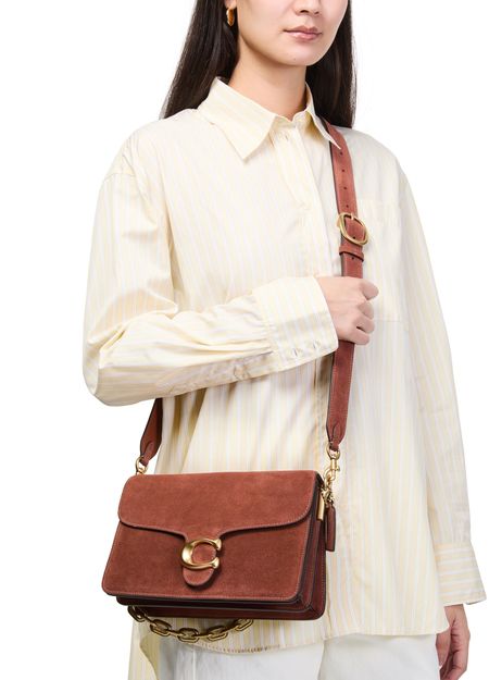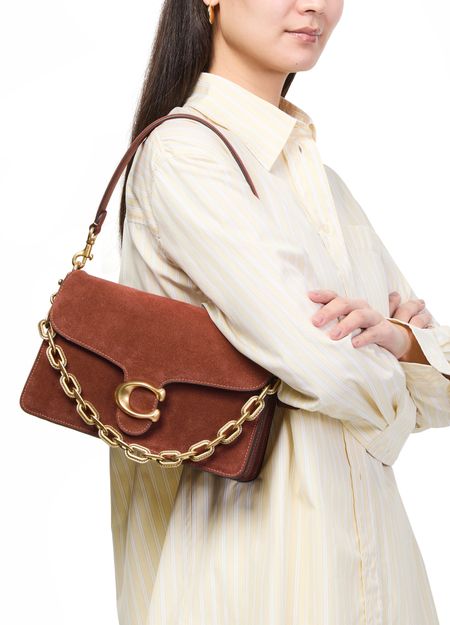 Reveal Coach's Tabby shoulder bag, crafted from sumptuous suede and adorned with a magnetic "C" buckle. The single handle and gold finish elevate its refined silhouette, while visible topstitching and a flap closure showcase Coach's attention to detail and modern sophistication.