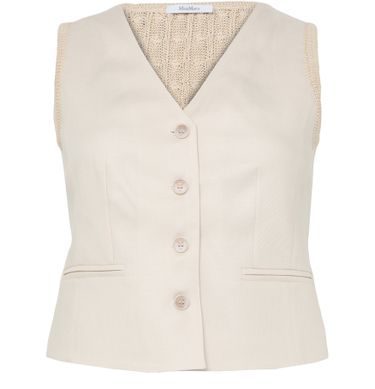 Reveal Max Mara's tailored waistcoat and Bermuda shorts suit, a modern ensemble featuring a short, collarless, and sleeveless silhouette. Button fastening and two front pockets add refined practicality. The crisp tailoring and versatile design make this set ideal for both polished daytime looks and elevated evening occasions.