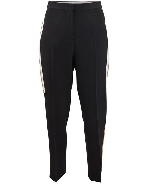 These tapered trousers bear the Burberry signature. The cut is enhanced by contrasting bands on the sides. These trousers are made in 100% wool and they fasten with a clip at the front. These trousers also feature two discreet side pockets. They are ideal for a formal, elegant and original look.