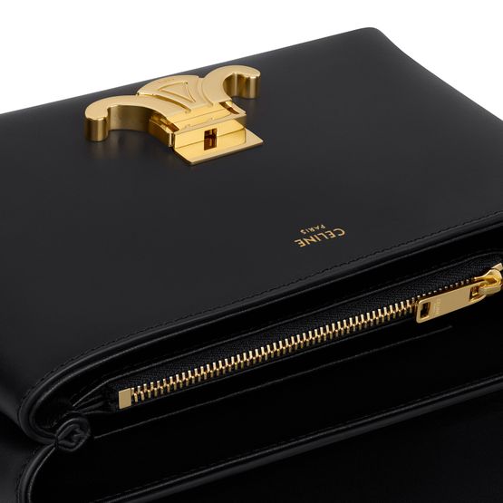Celine's Teen Nino bag in shiny calfskin is a versatile companion for any occasion. With its elegant Triomphe metallic closure, it boasts two spacious compartments and multiple pockets for organization. Carry it by hand, over the shoulder, or as a cross-body, adapting effortlessly to your style and needs.