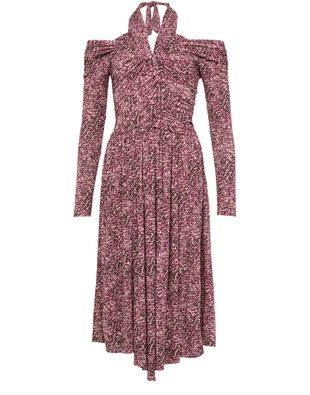 Isabel Marant's Valentine midi dress captivates with its draped detail and visible stitching, showcasing an all-over print. This long-sleeved, flared dress features a bare shoulder design and a fitted waist, perfect for cocktail and evening events. The lavaliere tie-neck adds an elegant touch, making it a standout piece.