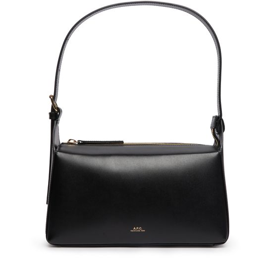 APC's Virginie Baguette bag is made of smooth leather with one adjustable handle for versatility. The logo in gold letters adds a touch of elegance to the minimalist design. It features a zipper closure and gold finish hardware. This versatile bag can be worn in the hand or on the shoulder for a chic and modern look.