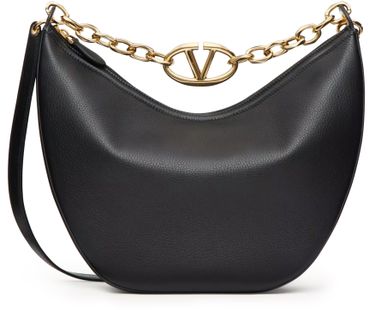 Valentino's Vlogo Moon medium hobo bag showcases visible topstitching and a sleek zipper closure, creating a stylish single compartment for essentials. The front logo in gold letters and metallic logo on the front add elegance, while the chain strap and single handle offer versatile carrying options, all finished with a luxurious gold finish.